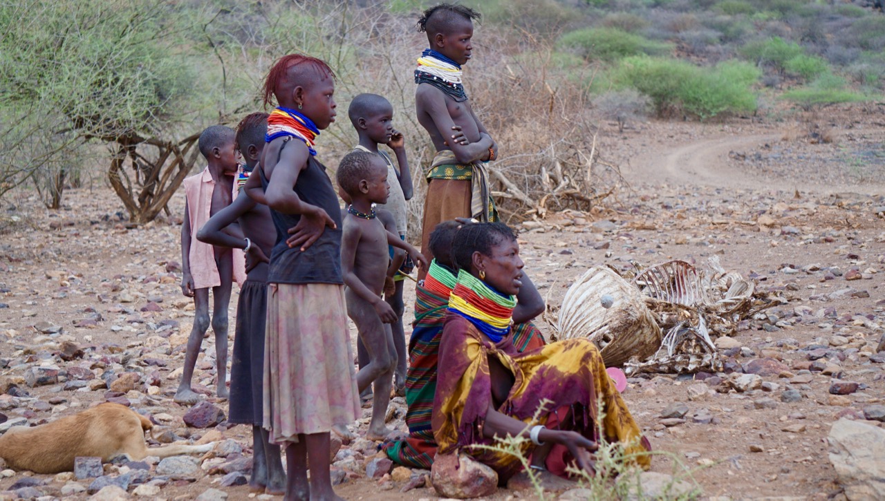 – Lopeli källan heter den och den betjänar 12 familjer här, berättar Eymo Ekaskut, den gamle magre mannen som tycks vara ägare till de magra åsnorna. Han pekar också ut över landskapet och vi förstår att det är återigen samma berättelse. Alla dom andra djuren är döda!