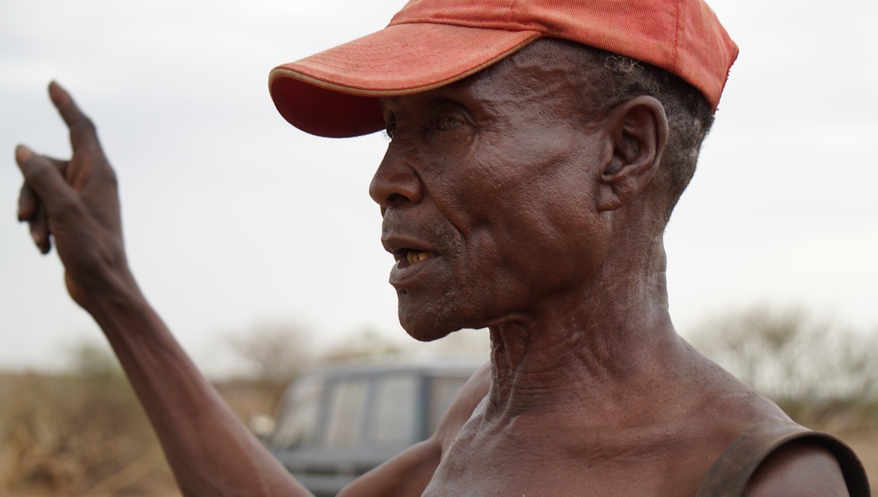 Som från ingenstans dyker det upp människor, barn, vuxna och gamla. En man med bar överkropp och röd kepsmössa inleder genast ett livligt samtal där han pekar både ut över marken och drar sitt finger tvärs över halsen.