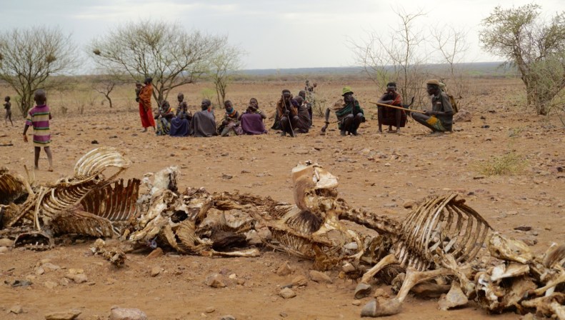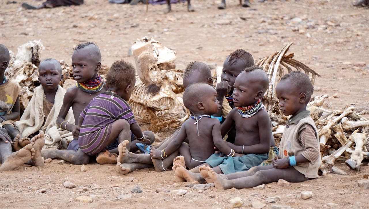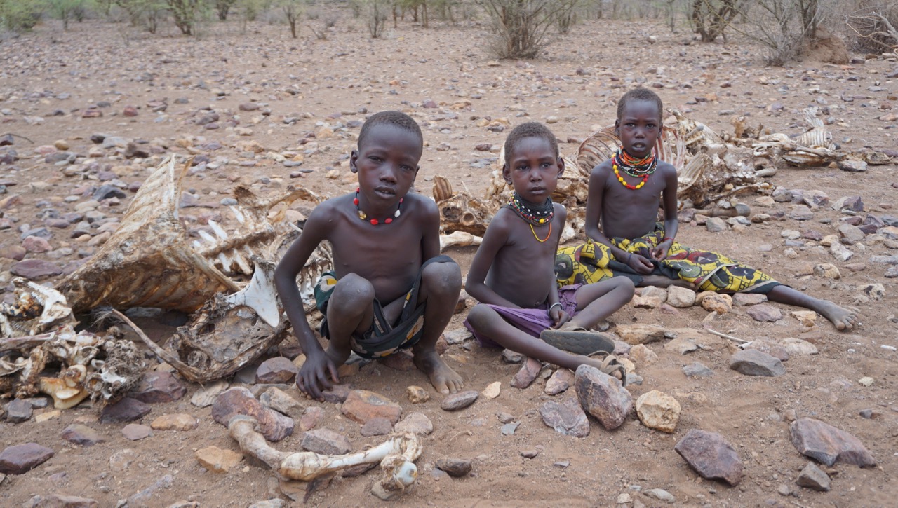 – Jo han heter Esekon Nang’ole och berättar att alla hans djur har nu dött av torkan. Många av benknotorna och kadavren ligger i högen där. Detta är hans barn som brukade vakta getterna och fåren, säger Joseph och pekar på en pojke i 10-årsåldern och en flicka i ungefär samma ålder.