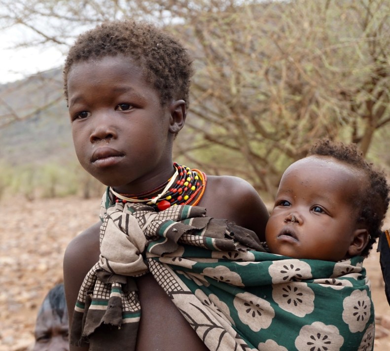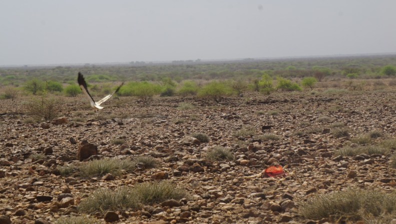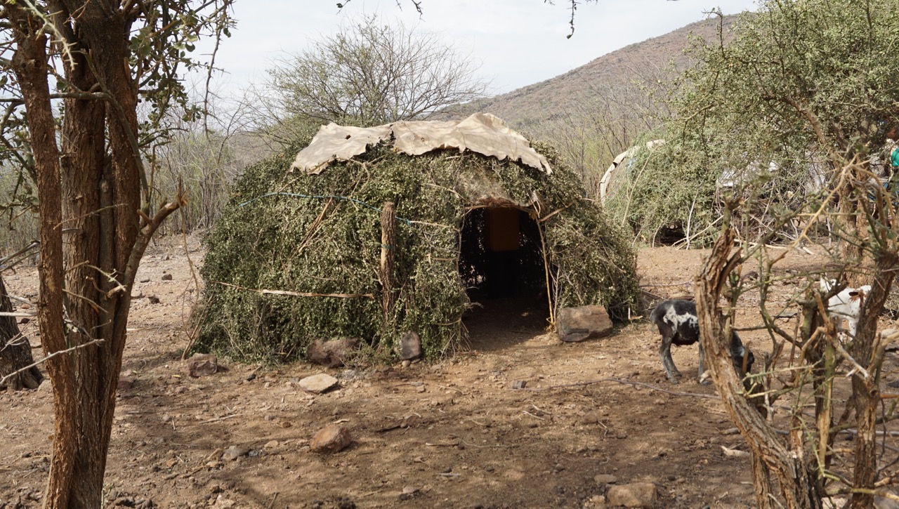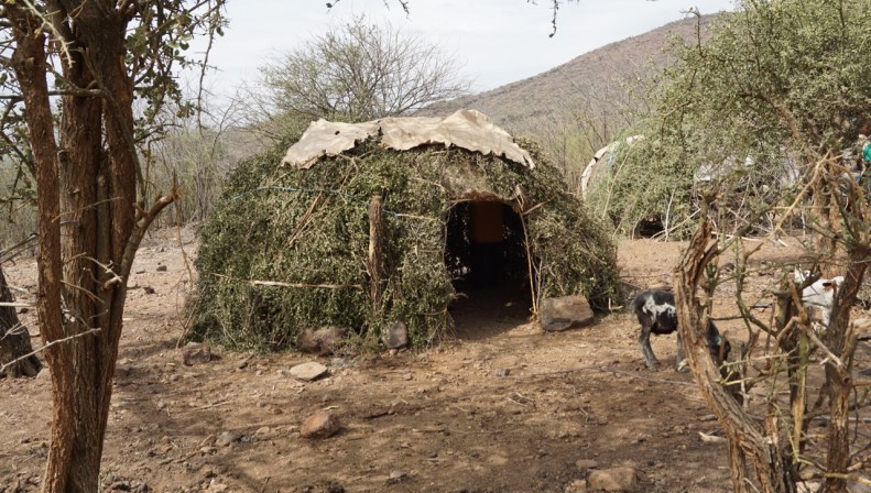 Några hundra meter in bland buskar och snår, över mycket stenig terräng kommer vi till några mycket enkla hyddor. En byggt helt med någon slags liten buske, och de andra delvis täckta med plast, papp el. dylikt. Strax till höger på tre små stenar ser vi en liten gryta med något som kokas i vattnet.