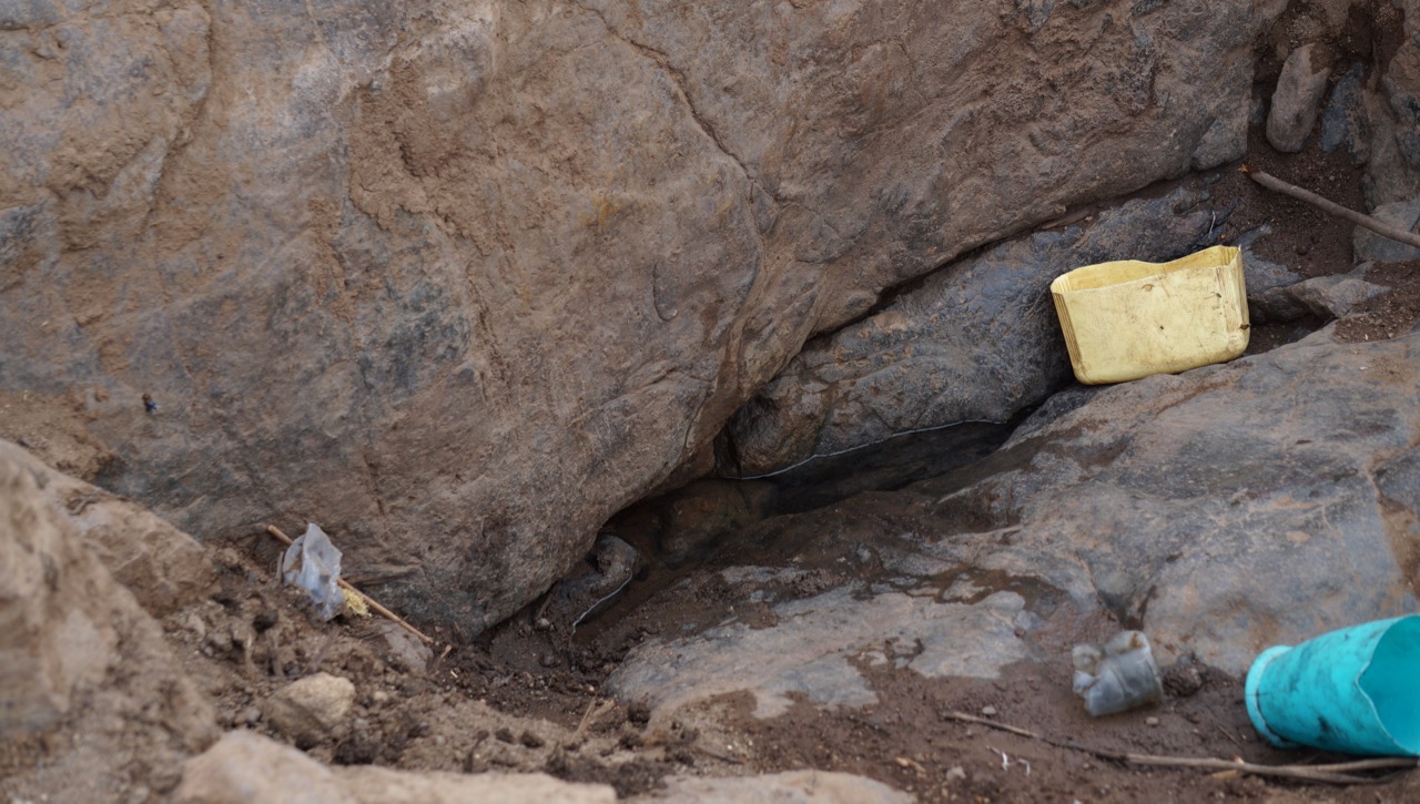 Vi kör vidare längs den steniga vägen. Några kilometer längre fram ligger ytterligare en bosättning. Här finns också en liten vattenkälla. Några åsnor dricker ur en gryta. Vi tittar ner i källan. Den ser ut att ha endast några liter kvar mellan klippblocken.