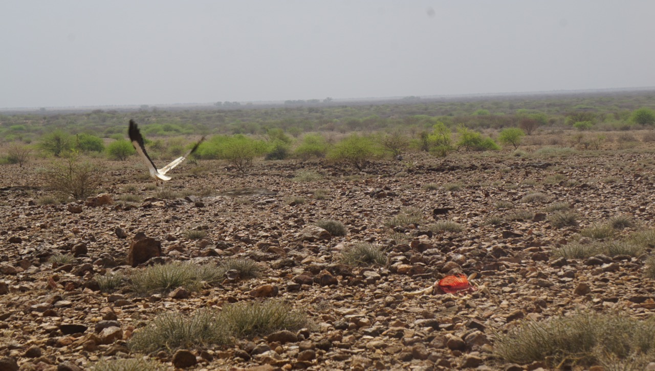 Och att vi djuren dör runt omkring får vi bevis för på hemväg, när en stor vacker rovfågel precis lyfter från ett alldeles färskt kadaver där revbenen lyser i rött.