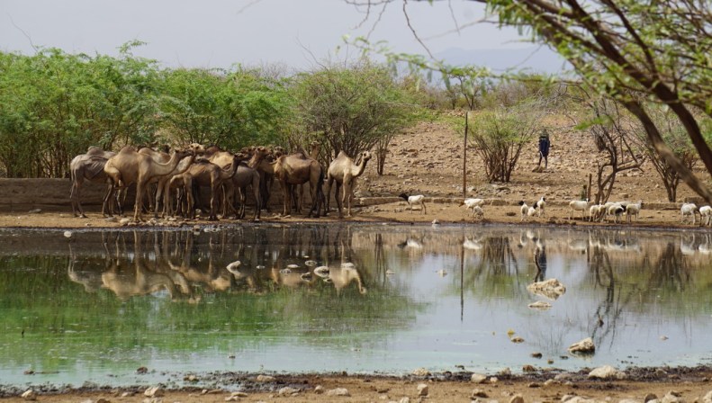 Vägen och landskapet blir allt stenigare och kargare och snart är vi framme vid bosättningen, Lotengan Erus. Erus betyder källa. Och mycket riktigt lite längre fram ser vi en alldeles grönaktig återspegling från en slags dam. Där skymtar också kameler. Kamelerna verkar var de som klarar sig längst i den ihållande torkan.