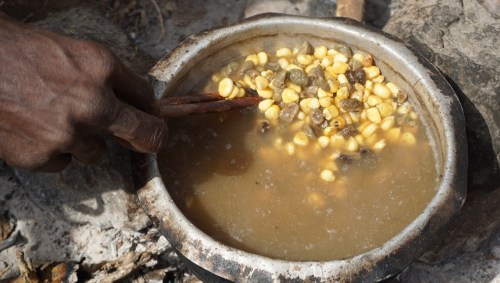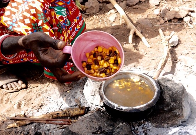 – Vi är sju vuxna och åtta barn, säger Emoyo och håller upp en mugg med lite majs och erut på botten.