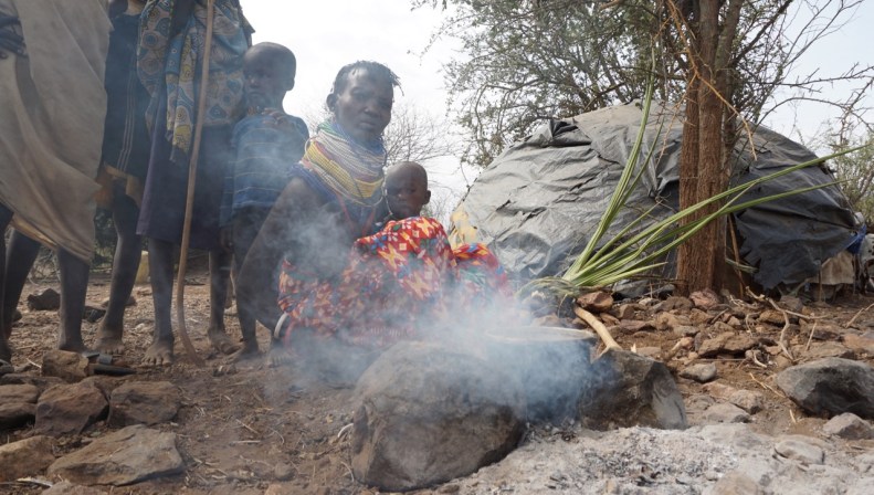 Emoru Etapar, kommer fram med ett av sina barn på höften och rör om med ett par pinnar.
