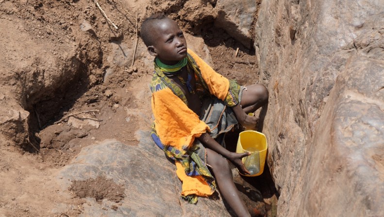Dricksvatten finns i en liten skreva flera kilometer ifrån Lorus och den ger max 100 liter på ett dygn. Flickan skopar upp i små portioner