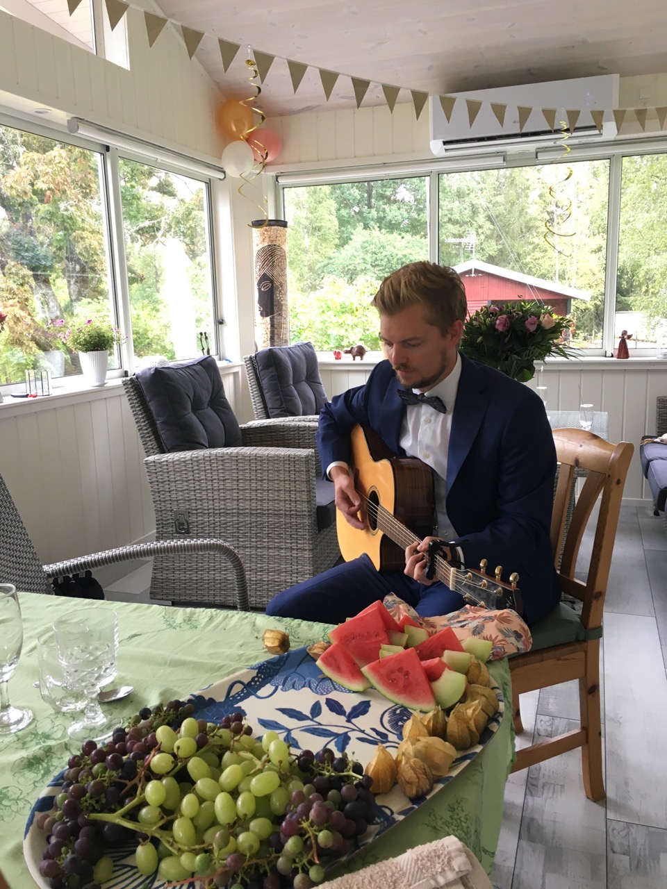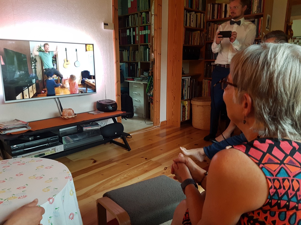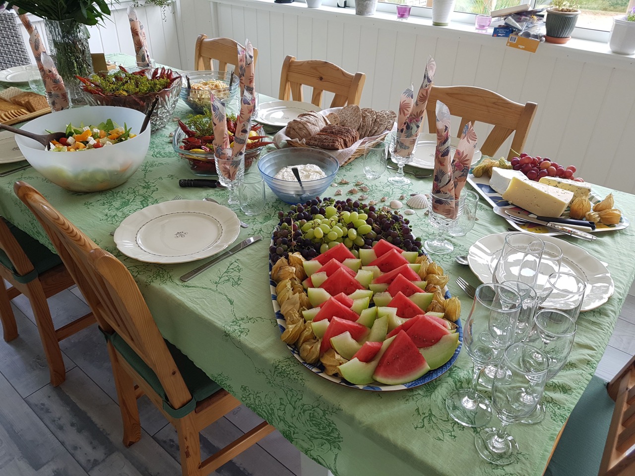 Saturday the 26th of August I got my life’s surprise! Unexpectedly (to me!), five of our six children (Emil, who lives up north, unfortunately couldn’t come) appeared in our garden with whistles and partypops, dancing and singing. KeA had lured me away for a while and this happened as we came back. I got so surprised that I cried out loud and it took a while until I settled. Then I was invited to a party not of this world at our veranda. A whole day with my beloved kids! They offered me delicious foods, self composed songs and music, sharing of memories, witty games and a video that made me laugh to tears … and more. All this just because I had turned 70.
